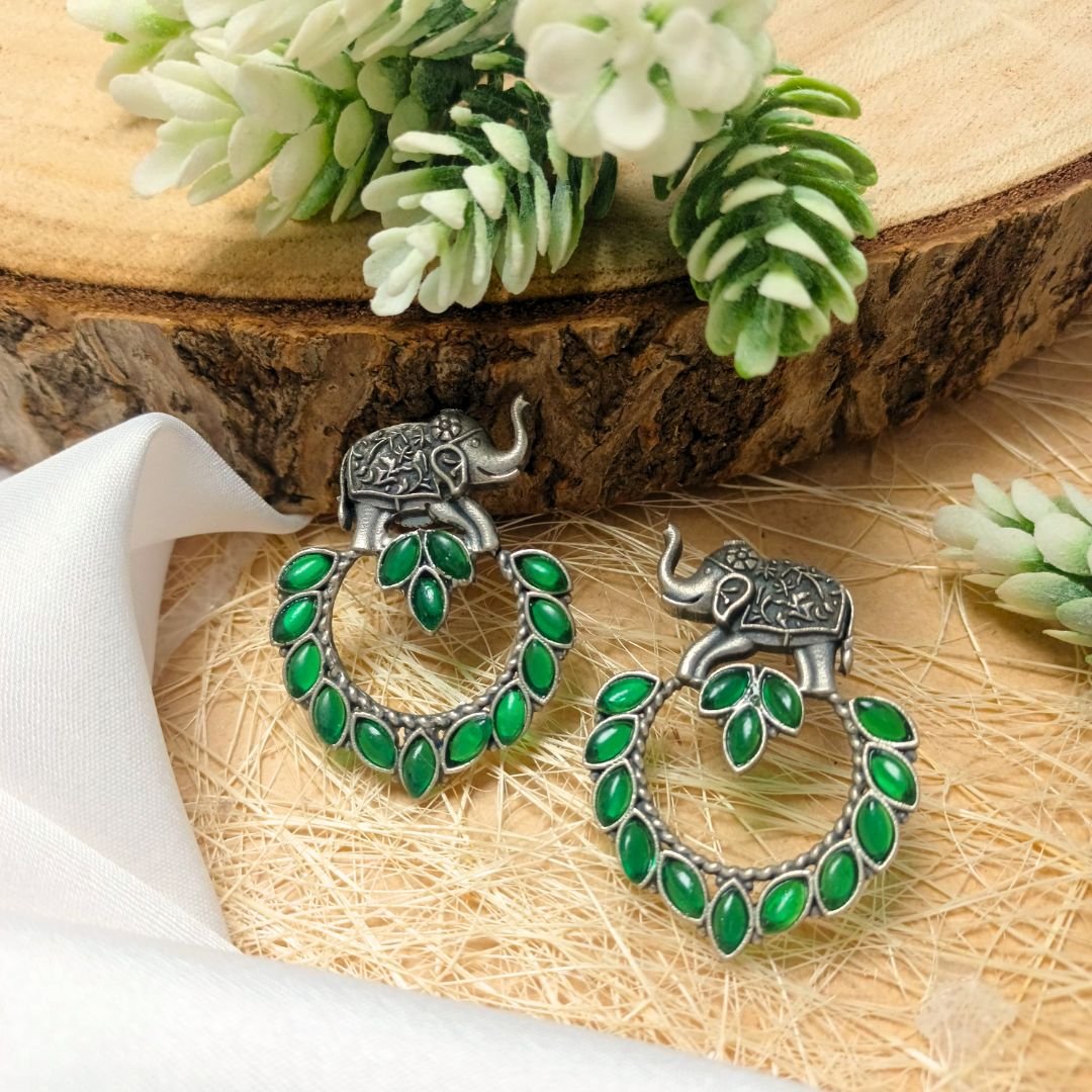 Danti Elephant Earrings with Emerald Green Leaf Stones – Jewar Collection