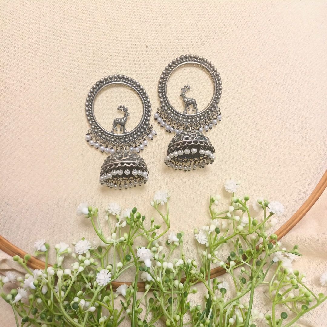 Also, the combination of the deer motif and pearl hangings creates a captivating aesthetic. Consequently, these jhumkas become a conversation starter.