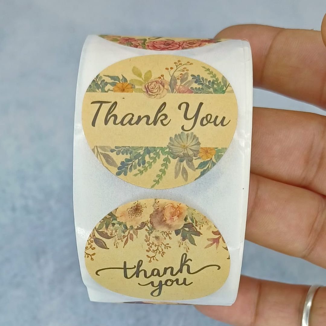 500 single line thank you stickers with floral designs, printed on matte-finish adhesive paper.